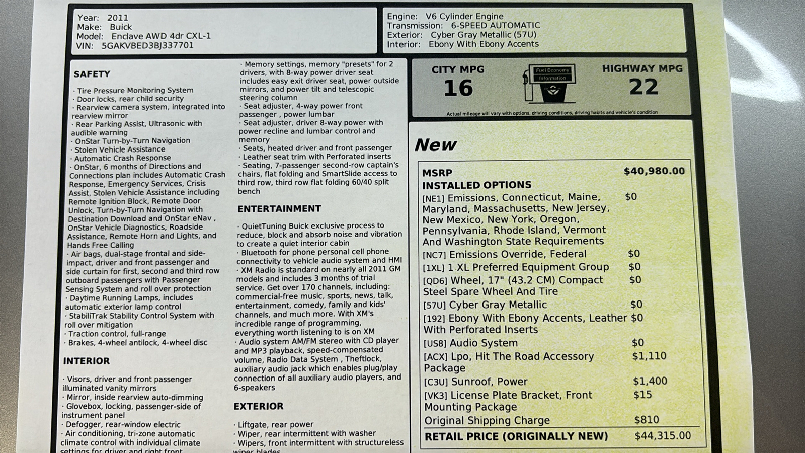 | VEHICLE NAME | BUICK ENCLAVE |