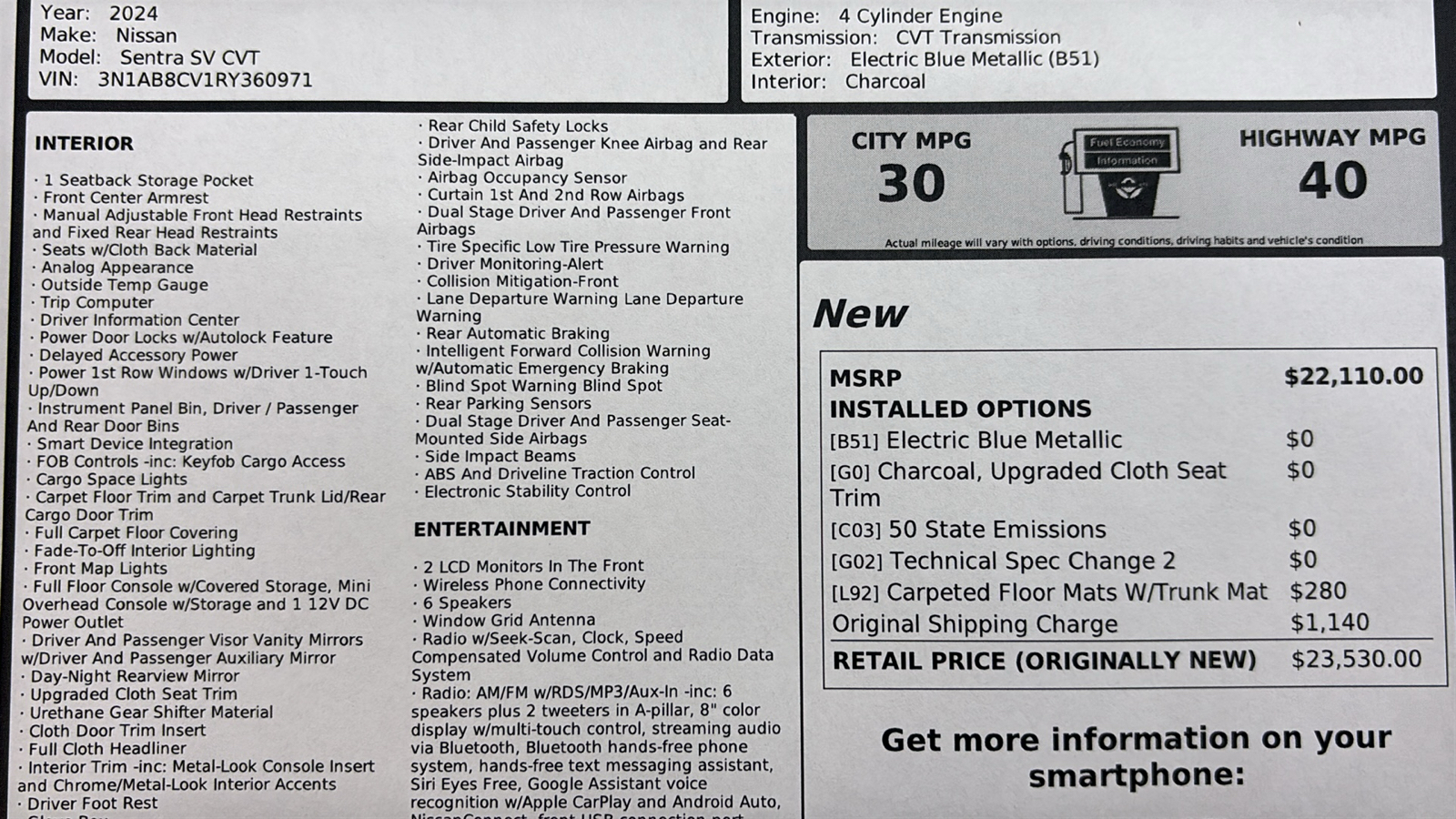 | EPA FUEL ECONOMY EST - HWY | 40 MPG |